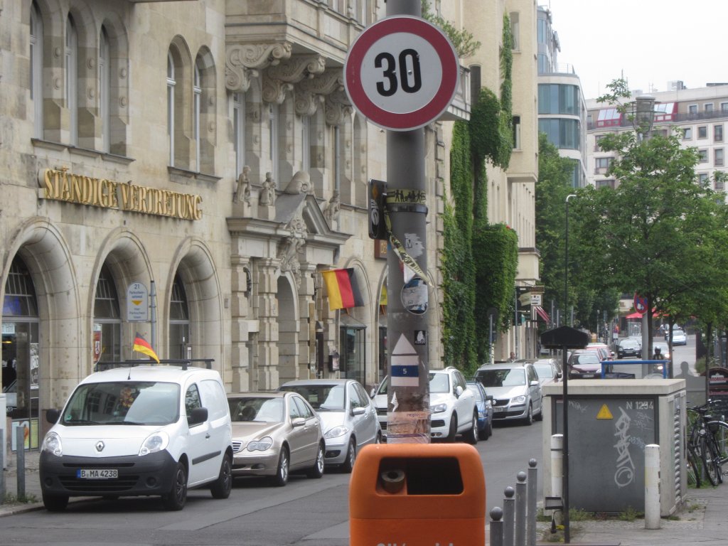 Verkehrszeichen für Dummies - in einigen seltenen Fällen werden symbolische Verkehrszeichen lieber noch einmal verbal erklärt. Hier ein Verkehrsberuhigter Bereich (Verkehrszeichen am Anfang der Straße) in Berlin