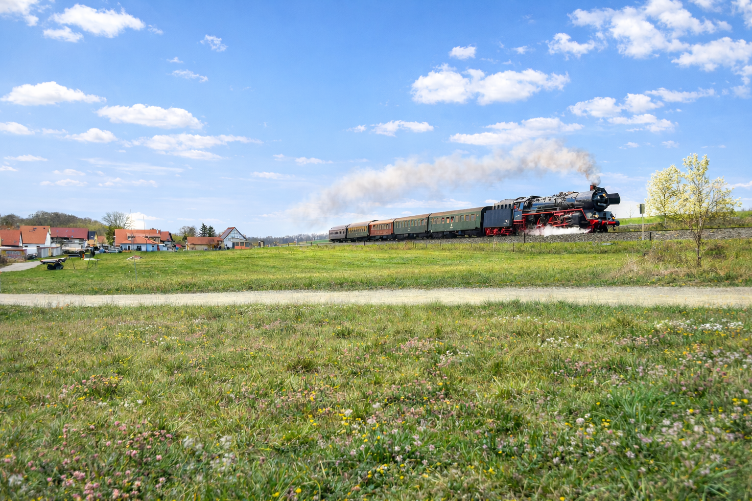 [Achtung, KI im Einsatz!] Auf der Tour Nr. 5 der 2026er "Dampfwolken rund um Saalfeld"-Touren der WFL könnte der mit 03 2155-4 bespannte Sonderzug am sonnigen Nachmittag des Karfreitags die Ortschaft Kleinschwabhausen an der Holzlandbahn zwischen Weimar und Jena passiert haben. Die Fahrt sollte von Saalfeld über Arnstadt - Erfurt - Weimar schließlich über Jena wieder zurück nach Saalfeld führen. (03.04.2026) Kevin Schmidt