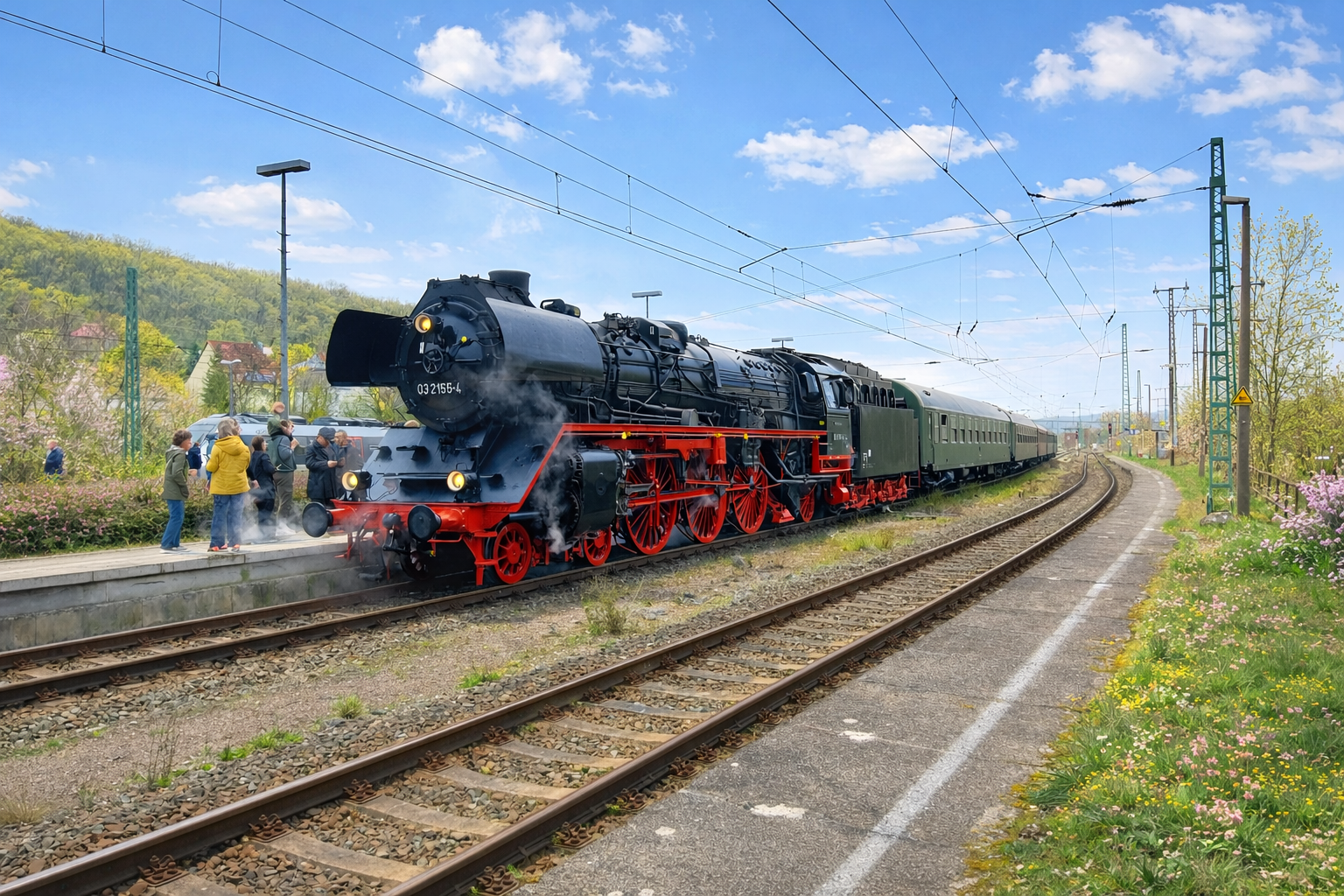 [Achtung, KI im Einsatz!] Auf der Tour Nr. 4 der 2026er "Dampfwolken rund um Saalfeld"-Touren der WFL könnte der mit 03 2155-4 bespannte Sonderzug am frühlingshaften Vormittag des Karfreitags auf Gleis 4 im Bahnhof Großheringen gestanden haben - hier wurde tatsächlich ein extra Fotohalt eingelegt. Die Fahrt sollte von Saalfeld ausgehend ab Großheringen anschließend weiter über Erfurt - Arnstadt wieder zurück nach Saalfeld führen. (03.04.2026) Kevin Schmidt