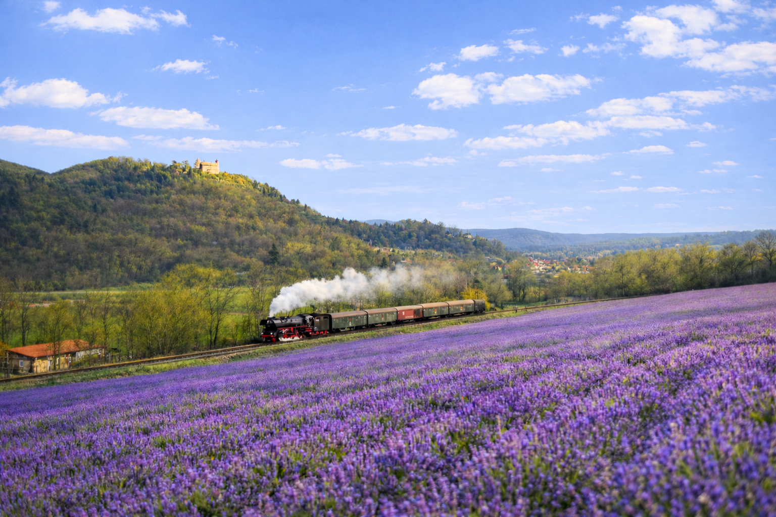 [Achtung, KI im Einsatz!] Bad Blankenburg am Rande des Thüringer Waldes ist historisch auch als Lavendelstadt bekannt. Genau am Fotostandort hier oberhalb von Watzdorf auf der Anhöhe Richtung der Ortschaften Böhlscheiben und Cordobang, mit der Burg Greifenstein im Hintergrund, hat es vermutlich früher tatsächlich so ausgesehen. Auf der Tour Nr. 5 der 2026er "Dampfwolken rund um Saalfeld"-Touren der WFL könnte der mit 03 2155-4 bespannte Sonderzug diese reizvolle Szenerie am sonnigen Nachmittag des Karfreitags passiert haben. Die Fahrt sollte von Saalfeld über Arnstadt - Erfurt und weiter über Weimar - Jena wieder zurück nach Saalfeld führen. (03.04.2026) Kevin Schmidt